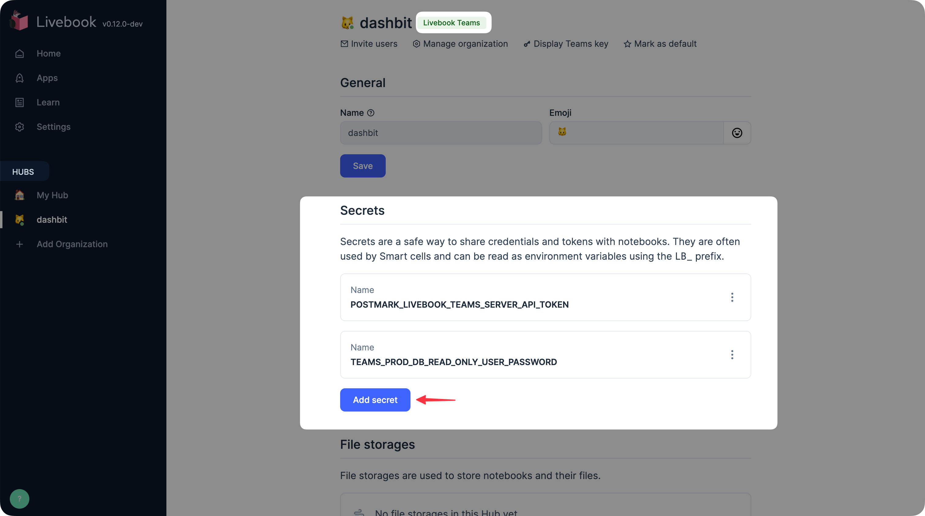 Just add a secret to your organization hub, and Livebook Teams will synchronize it with the Livebook of every member of your organization.