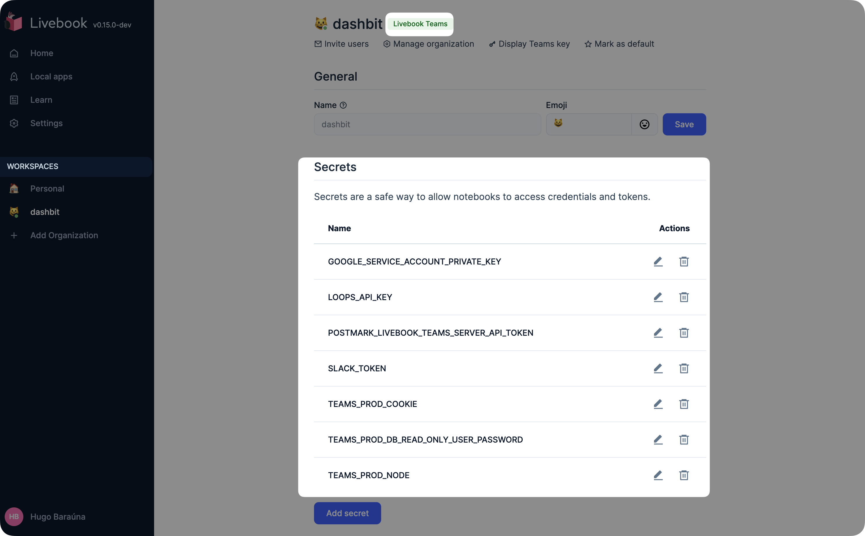 Just add a secret to your organization workspace, and Livebook Teams will synchronize it with the Livebook of every member of your organization.