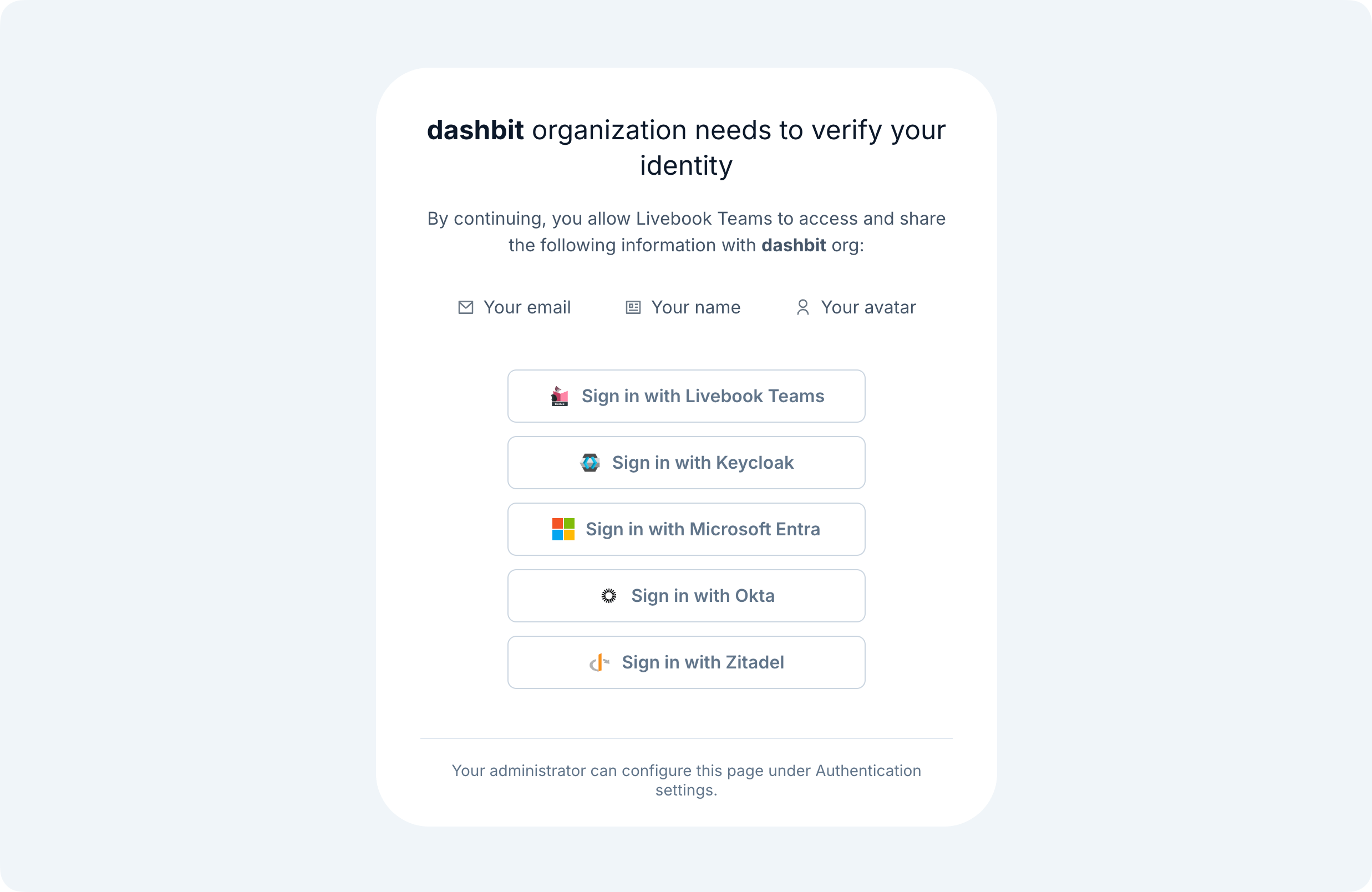 Livebook Teams supports OpenID Connect (OIDC) Single Sign-On, allowing you to authenticate users through your existing Identity Provider (IdP) when they access your app servers and Livebook apps.