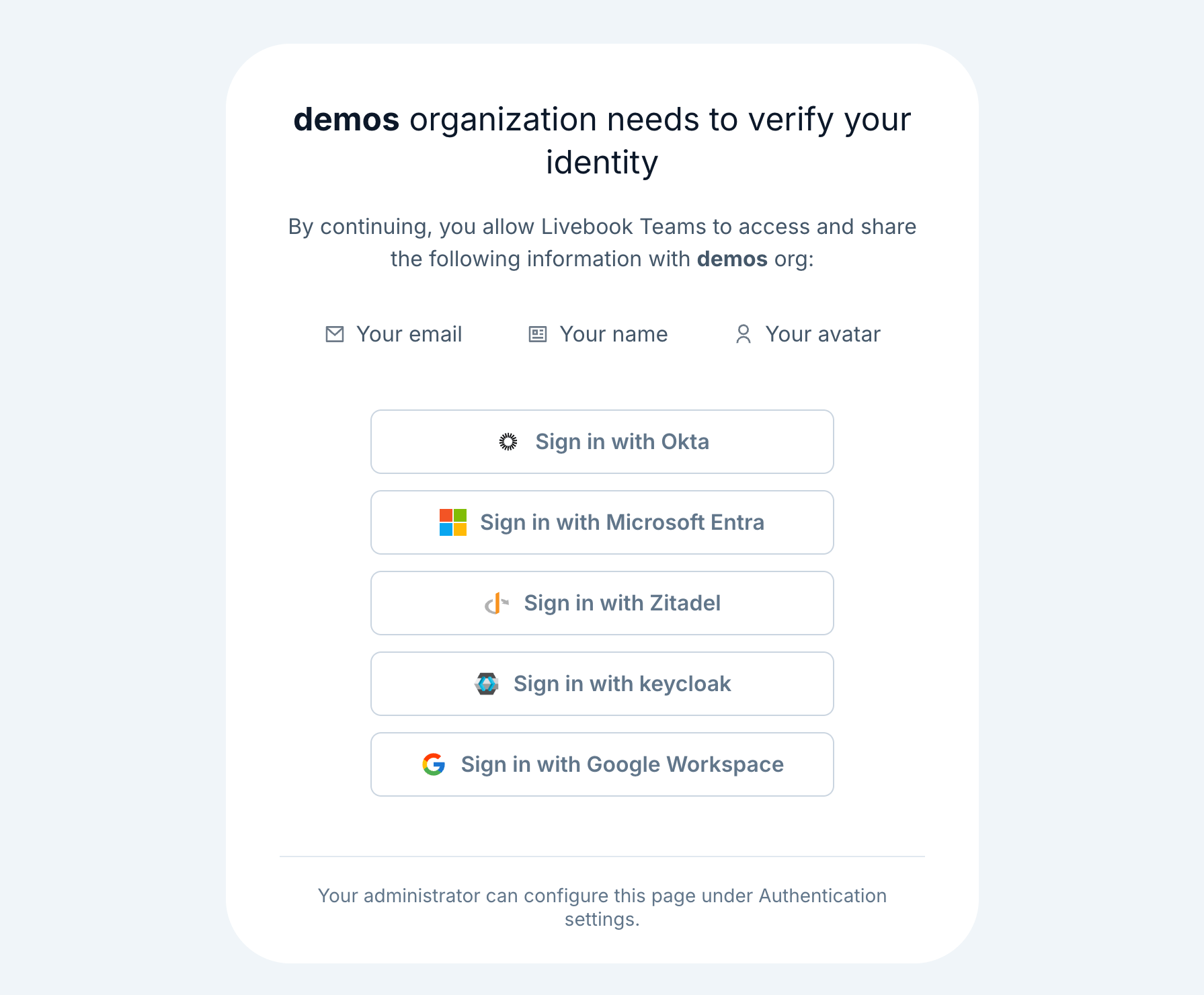 Livebook Teams supports OpenID Connect (OIDC) Single Sign-On, allowing you to authenticate users through your existing Identity Provider (IdP) when they access your app servers and Livebook apps.