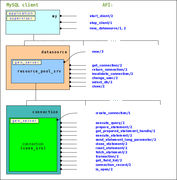 The client allows to connect to MySQL server and execute SQL query. It provides connection pooling mechanizm for concurrency efficience. The client is written on Erlang and very closely follows MySQL Connector/C interface. It can be called MySQL Connector/Erlang but has some restrictions in functionality (recent version has no SSL support). Design is based on protocol description from http://mysql.timesoft.cc/doc/internals/en/index.html. The client was tested on MySQL server version 5.1.51, 5.5.9 and 5.6.2 on Windows/Linux/MacOSX boxes.